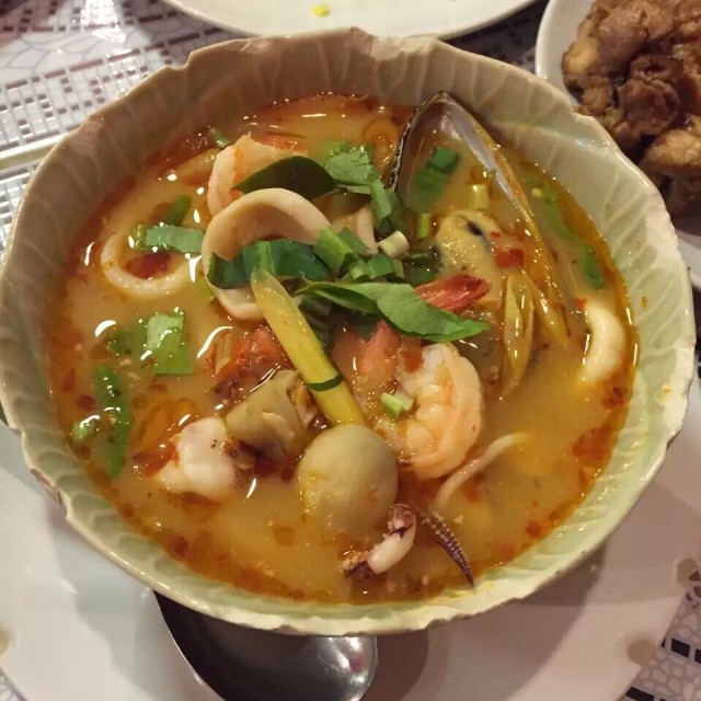 装修感觉有点怀旧,在惠福东路上开业很长时间了,感觉顾客不算很多,所以基本上不用等位的,这就最适合心急的我了。菜品的价格和大头虾差不多,但是总体感觉他家好像更接近正宗的泰国菜。我们点了一个荷叶包鸡,他不是我们粤菜那种蒸鸡的做法,他是烤熟的,荷叶包着就像一个小小的粽子一样,外表的荷叶都被烤的脆脆的了,打开荷叶就闻到里面扑鼻而来的香味,里面的鸡肉还是嫩嫩的,有亮亮的鸡油流出来,吃起来很香很滑哦,而且还是没有鸡骨头的,全都是鸡肉,很可口哦。还有就是酸汤鱼了,大概是这个名字吧,鱼汤很酸,更突出了鱼片的鲜味,而且鱼片基本上没有什么鱼骨的,吃起来嫩滑,酸酸的很好下饭哦。查看更多
