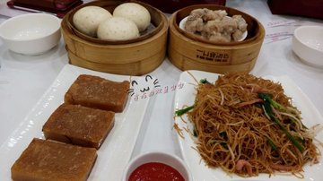 同学住在龙洞,为求方便,于是在这家东江海鲜酒家喝午茶,它家也是渔民新村旗下的,所以可以用会员卡,所以还是挺优惠的。以前貌似工作日都不收茶位的,只收周六日节假日的,但是今年就全部店都收茶位了。没有以前划算了。这家没有沿江中路那家火爆,不用等位,坐下后三个人就开始点东西吃了。三丝炒米粉,习惯性地配上它家的辣椒酱。分量足够四个人吃,新鲜炒出,还是热热的,有镬气,可惜忘记跟厨师说多加点韭菜了。辣椒酱是外面能买到的,有点像7-11便利店的那种类型,微酸微辣的,不是每个人都喜欢,但是挺开胃的。金丝燕麦包,吃过很多次。记得早餐外带的话是四块钱还是三块钱一个的,也不便宜。堂食就十四块钱三个,比较贵。但确实好吃,外面的面包有燕麦,然后里面是椰丝花生白糖等等,但是口感偏甜,牙齿不好的时候真心不好吃。煎年糕,一份三件,现点现煎。外皮煎得很香口,年糕吃下去也是很软糯的,但是,遗憾没有点都德的脆皮年糕好吃,可能是少了椰汁味道吧。蒸排骨,同学说没有荤菜,就要了一份。额,这应该是我最不喜欢的一道,无论是在哪里喝茶。蒸排骨都是很多粉裹着,说是排骨,其实肥肉超多,骨头不怎么看见。搭配南瓜或者芋头还算好的,遇上豆豉的蒸排骨真的不怎么想吃。个人口味问题吧。三个人,拿了四份吃的,超饱,炒米粉最后还是吃不完的。吃了很多次东家的各种早茶午茶下午茶,但是种类还是那些,完全没新鲜感,最希望就是有些新的食物能再勾起食客的食欲。
