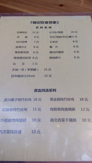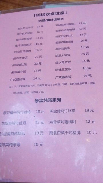 这间锦记饮食世家是在江南西青柳大街的,一个小区的隔壁。我是从昌岗地铁站过去的,然后步行到华海大厦公交站,左转进去十香园的方向,然后直走差不多一公里才找到的。其实从江南西出去的话比较好找,就在福岛料理二店的旁边。大概六点半到店的,没有别的客人,外卖单也不多。可能这里做夜宵生意吧。店的菜单主要是烧腊还有炖汤的。团购了一份一元叉烧,就再点了一个豉油鸡腿饭和原只椰子炖竹丝鸡。店不大,但是门口有几张桌子,还OK吧,就是夏天蚊子多了点的。店员和老板的服务态度都是很好的。原只椰子炖竹丝鸡,18元,三颗星。整只椰子上,里面是些竹丝鸡肉和几粒枸杞子。味道OK吧,应该是刚做好的,鸡肉不会渣,汤底比较清甜。但是不会惊艳,在家也能做。叉烧,1元,加2元茶位费,三颗星。叉烧是肥叉,花肉做的,遇到了喜欢吃瘦叉的我。也是刚做好的,就在门口的一个容器里面煮好的。令我想起了电饭煲叉烧,所以味道也是很家常的,ok。但是吃多了会腻,好肥啊,有烤箱再烤一下就很好吃。这家店的食物味道OK,但是太慢了,真是现点现做的。六点半下单,七点十五才拿来鸡腿饭,我是在外面看着厨房做的,我以为是平时烧腊店的那种,原来是家常做法,估计回家我也会做电饭煲豉油鸡腿了。豉油鸡腿饭,19元,三颗星。鸡腿饭不应该是整只鸡腿上的吗?厨师居然把我的鸡腿给剁了,早知道直接要豉油鸡饭,还只要16块钱的。味道就是电饭煲豉油鸡腿,鸡肉还不错,不是软软的那种。配的菜心镬气足,很好吃。饭的话只有一碗,好少啊,不知道能不能免费添饭的。结账39元,加团购的就40块钱。味道OK吧,但是做法太家常了,不惊艳,可能鸡煲和鲍鱼鸡煲挺好吃吧。店员服务很好,但是上菜慢。…查看更多