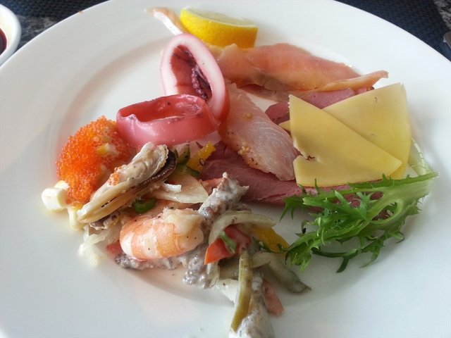 祥云的冷盘种类不少,有各式火腿芝士,三文鱼等,芝士味道一般般吧。这里刺身不多,就是三文鱼,北极贝,还有希鲮鱼,都还比较新鲜,符合五星出品。