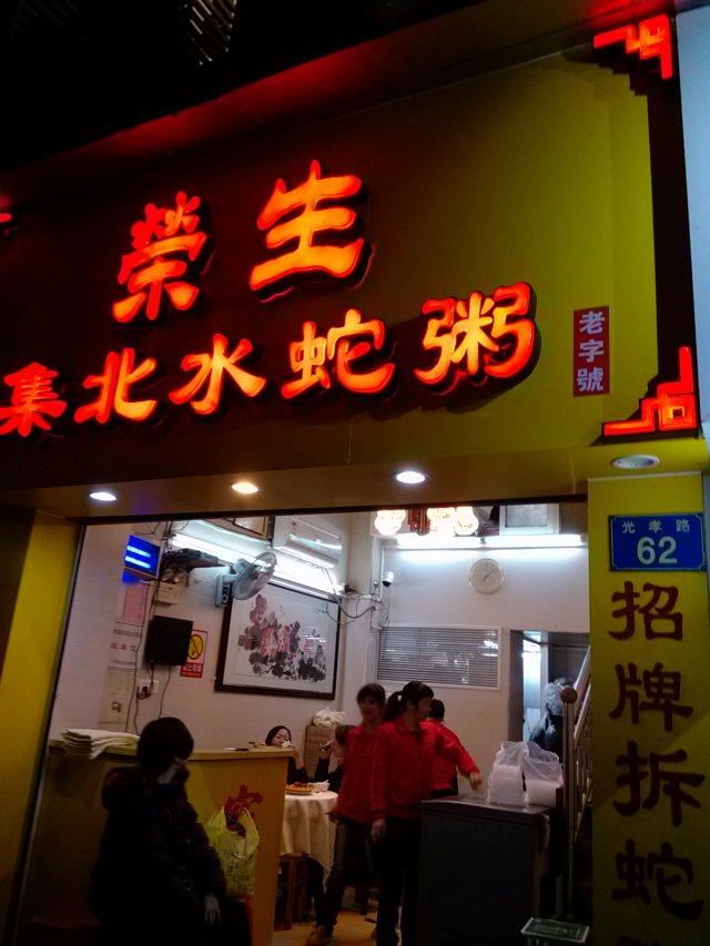 这里是吃顺德菜为主,水蛇粥是招牌菜,我们点的是带骨的水蛇粥,蛇比较小不过料很足(可以看我拍吃完后的蛇骨)就是味道很一般,他们应该是先煮好一大锅粥底然后再根据客人点单后再下料,