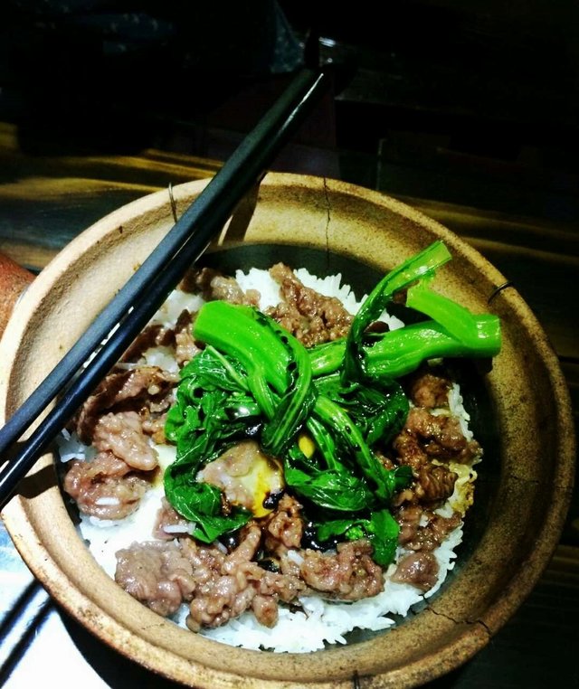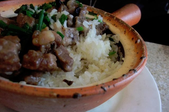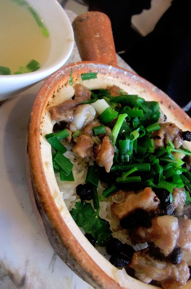 豉香排骨煲仔饭:香喷喷的煲仔饭,下单之后,至少要等20分钟,所谓好东西是需要等待的!看着今天的排骨不错,果断点了一份豉香排骨,焦香的煲仔饭表面,放了满满的一层排骨,排骨的骨头不算多,而是不少的软骨。排骨的肉质不会过于粗糙,嫩滑度刚好,唯一可惜的是豆豉的香味不明显,感觉看起来像是一颗颗腌渍过的黑豆而已,不如切碎豆豉的香味浓郁。不过如果是不吃葱花的朋友,估计看到这一大把的葱花会崩溃掉的,对于我来说味道正好!葱花和豆豉,加排骨,再来一口有点焦香的白米饭,爽歪歪了!…查看更多