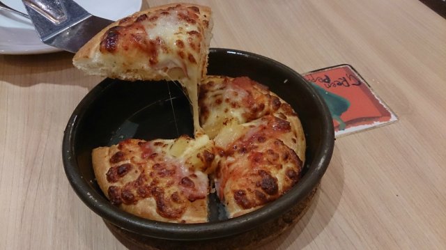 是日是小朋友的生日,陪他玩了一个上午也够累了,于是中午便带他去吃pizza算是小庆祝喇以为这个广场人比较少,这边的食肆也多不了什么人,但原来这里的餐厅还挺旺场的,尤其是最高层的两家酒楼,等位的人更是大排长龙。而我们选择的pizza hut也不例外,一到午饭时间,虽然并没有夸张到要叫号等位,但也是客满的哦,幸好我们来得比较早,可以占据沙发的有利位置,小朋友也比较欢喜。我觉得pizza hut把自己打造成亲子餐厅还蛮成功的,餐厅的食客有老有小的,环境挺温馨,装修格局也挺和谐的。但就是不明白,明明是开张不久的餐厅,为何有好几只餐碟都是缺口的呢,这样一不小心就很容易弄伤的喔!:(虽然是生日小庆祝,但由于我们都是食量比较少的人,所以只点了两份工作日特惠午餐罢了。套餐包括了一份沙拉、一个主食和一杯饮品,每款食品都会提供多于两项的选择。同一价格的特惠午餐有两个不同的主食可供选择,刚好我们可以各来一份试试。沙拉1.美式土豆沙拉 对这份沙拉还觉得蛮惊喜的,可能本来对这些小前菜没报什么期望吧。冰凉的土豆粒配上清爽的沙拉酱,还蛮开胃的。2.缤纷蔬菜沙拉 颜色确是挺缤纷的,五颜六色的,但觉得蔬菜都没什么特色,以生菜为主,算是勉强过关吧~主食1.夏威夷风光比萨 经典的厚底pizza,饼底超厚像是在吃面包,不过也是这家店的特色吧烤得蛮香的,拉丝还不错,只是可能pizza的尺寸太小了,所以配料也不是很多,只有可怜的几块菠萝和肉而已:(2.秘制烧味双拼炒饭 肉还蛮多的,只是所谓的烧味双拼中的叉烧未免也放太多色素了吧,那种不自然的鲜红色根本就不是烧出来的颜色,挺造作的。而另一味烧味应该是烧鸭之类的东西吧,不太能吃出什么,也不太能看出是烧出来的。炒饭的味道更是令人”深刻“,因为根本就是没味的,实在是很清淡的一个炒饭啊!:(如此的出品真的让人挺失望的,难道套餐就是这样吗?饮品1.黑珍珠红豆奶茶 味道还不错,珍珠包着红豆还挺特别的。2.经典现磨咖啡 印象当中好像从来没喝过这么淡的现磨咖啡:(虽然能喝出咖啡不是用即溶咖啡来忽悠,但味道实在是太淡了,是放太多水了吗?这样的套餐价格确实是挺实惠,份量也是挺足的,但似乎味道就有点打折了,只能说对得起这样的价格罢了~查看更多