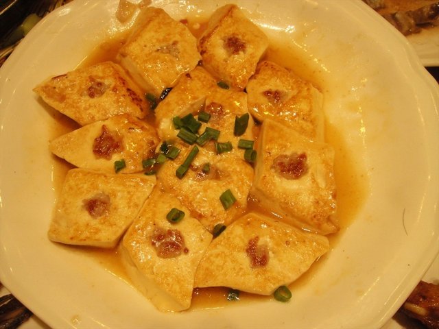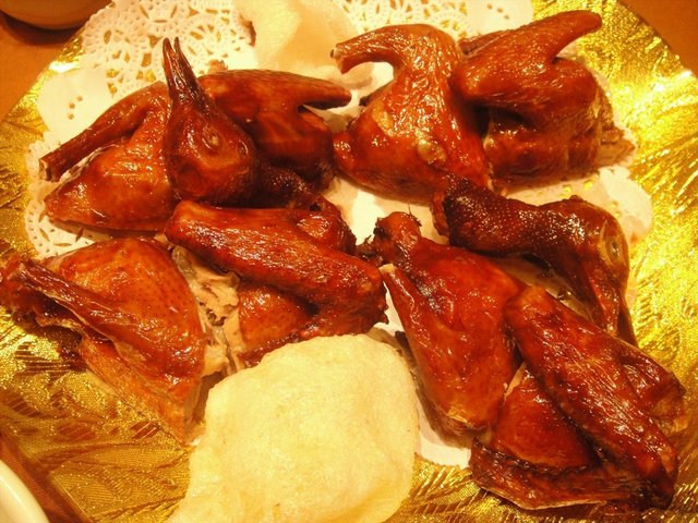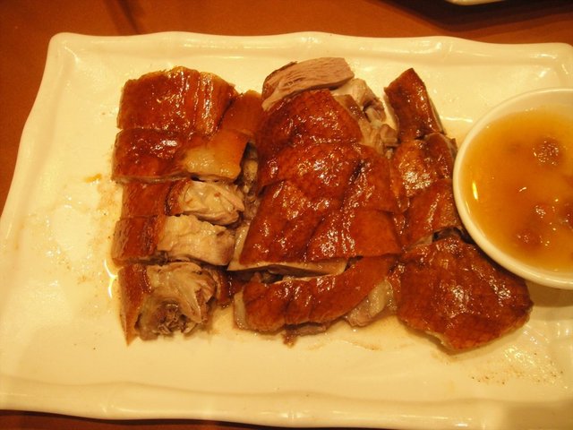 当晚我们六人点了招牌白切鸡、烧鹅、煎小鱼仔、蒜香骨、家乡煎豆腐、清蒸鲩鱼、烧乳鸽、美极鸭下巴、清炒菜心九个菜,吃货嘛,是能吃了点,见笑了。