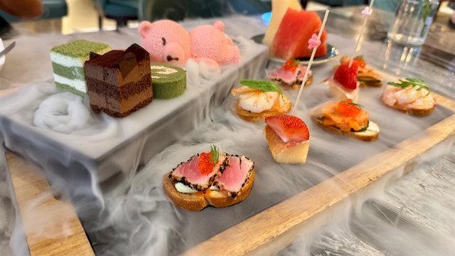 咸点包含烟熏三文鱼、帕尔马火腿、蔓越莓鸡肉和金枪鱼,搭配新鲜水果与迷你糕点。我们点了果汁和咖啡,看这明艳的色调多惊艳!果香清新毫无冰渣感,158元的優惠套餐性价比超高。菜单还有牛排、沙拉、米饭、意面、鱼排、汤品、海鲜、披萨等丰富西餐选择,值得下次尝试。