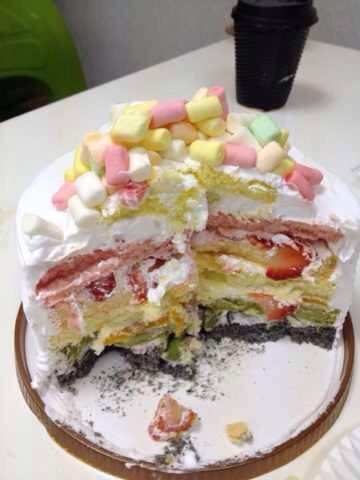 长寿路这边有两家美心,一家在地铁里面,一家在恒宝广场正门,都很方便。因为喜欢张智霖,当然不可以错过他卖广告的彩虹蛋糕,外表看起来平平无奇,但内里可是色彩斑斓的!里面有新鲜的草莓,芒果,奇异果,不过可能 不是应节的水果,有点酸酸的,不过配上甜甜的蛋糕和奶油,酸酸甜甜,口感很好呢,这样不会觉得很腻!…查看更多