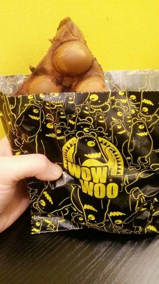 路过的时候看到一间店铺很吸引我,店铺不大但是招牌很显眼,主要是港式小吃。看到有些学生拿着巧克力味的鸡蛋仔看起来很好吃,所以我也要了一份名叫朱古力流心鸡蛋仔!闻起来是很浓的巧克力味挺香的,但是一份十几块觉得价格是有点小贵的!吃起来巧克力味还是有的,但是不是很浓郁,没有什么鸡蛋味,吃起来挺香的但是很热气咯。。重要的还是这鸡蛋仔没有流心,这点感觉有点失望咯~~~不过这家店的小熊标记还是很可爱很萌哦,老板人也很好,所以还是给个GOOD呀