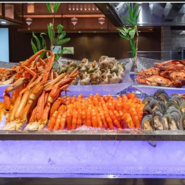 海鲜档口:雪蟹脚,扇贝,青口,大虾,老虎蟹,八爪鱼,翡翠螺等