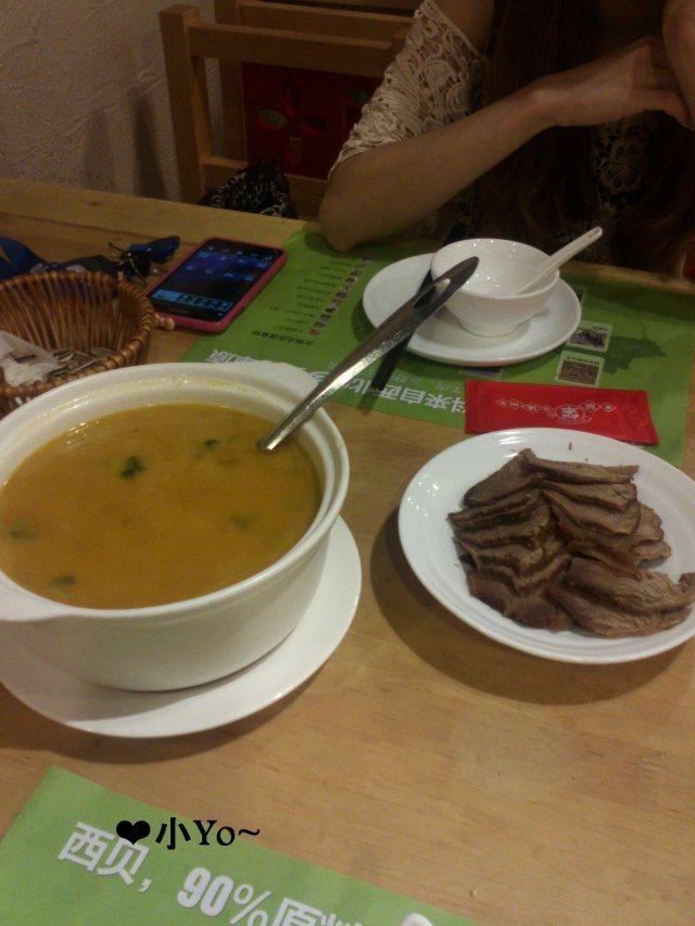 同家姐两个人嘅晚餐,带佢嚟呢度尝鲜下,因为佢未食过西贝菜啊!!嚟到唔系好多人,因为佢唔食得辣,所以我哋点嘅只能系不辣的~~要咗个招牌菜,莜面鱼鱼(蘑菇汤底)细嘅,一个酱牛肉,一个奶白菜炒木耳,系网上下载咗消费满100减30嘅优惠券,莜面鱼鱼就系面粉嚟整成嘅主食,味道都系咁喇,酱牛肉好干啊!!真系好难吞得落,奶白菜炒木耳,冇咩味道,有几条白菜仲系苦嘅,茶位要3蚊一位,总嘅呢餐都好令人失望下咯!买单减咗30都要80几蚊!
