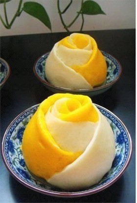 1、发两块面团,一块用南瓜和的黄面团,一块白面团。