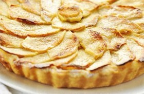3.在做好的派皮上均匀的涂抹一层杏仁奶油馅,然后将切成薄片的苹果均匀的码放在派皮上,再均匀地在上面撒上细砂糖和黄油丁。