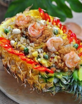 6.依次放入鸡蛋菠萝和虾,虾最后放,不然会老掉的,不用其他调味料了,炒匀之后就可以装在菠萝里出菜了。