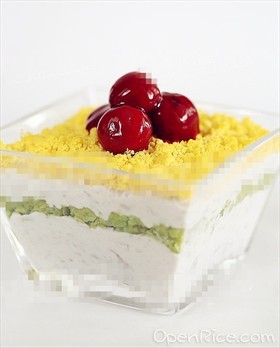 6)将已经做好的奶油芋泥盛入碗中,中间撒一层豌豆泥,再覆盖一层奶油芋泥,最后撒上蛋黄即可。