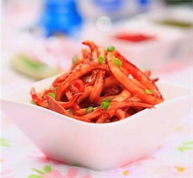 色泽红亮,滋味浓厚,味微辣,口感脆嫩。