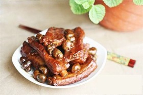 广东风味菜,成菜色泽红亮,外焦里嫩,汁味浓厚。