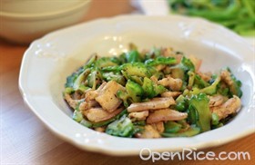 5加入挤干的苦瓜,与五花肉大火爆炒,直至苦瓜变得很翠绿,就洒一点酱油调色调味,加入豆豉翻炒均匀,即可上碟。