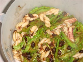 2、将苦瓜去籽,清洗干净,切成条,备用。