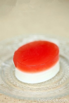 4. 鱼胶粉溶液浇入西瓜汁中拌匀,装入模具,放入冰箱冷藏至凝固;