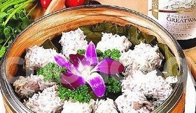 3、牛胸条拍干淀粉粘满香米放入蒸笼中,大火蒸制45分钟后装盘;