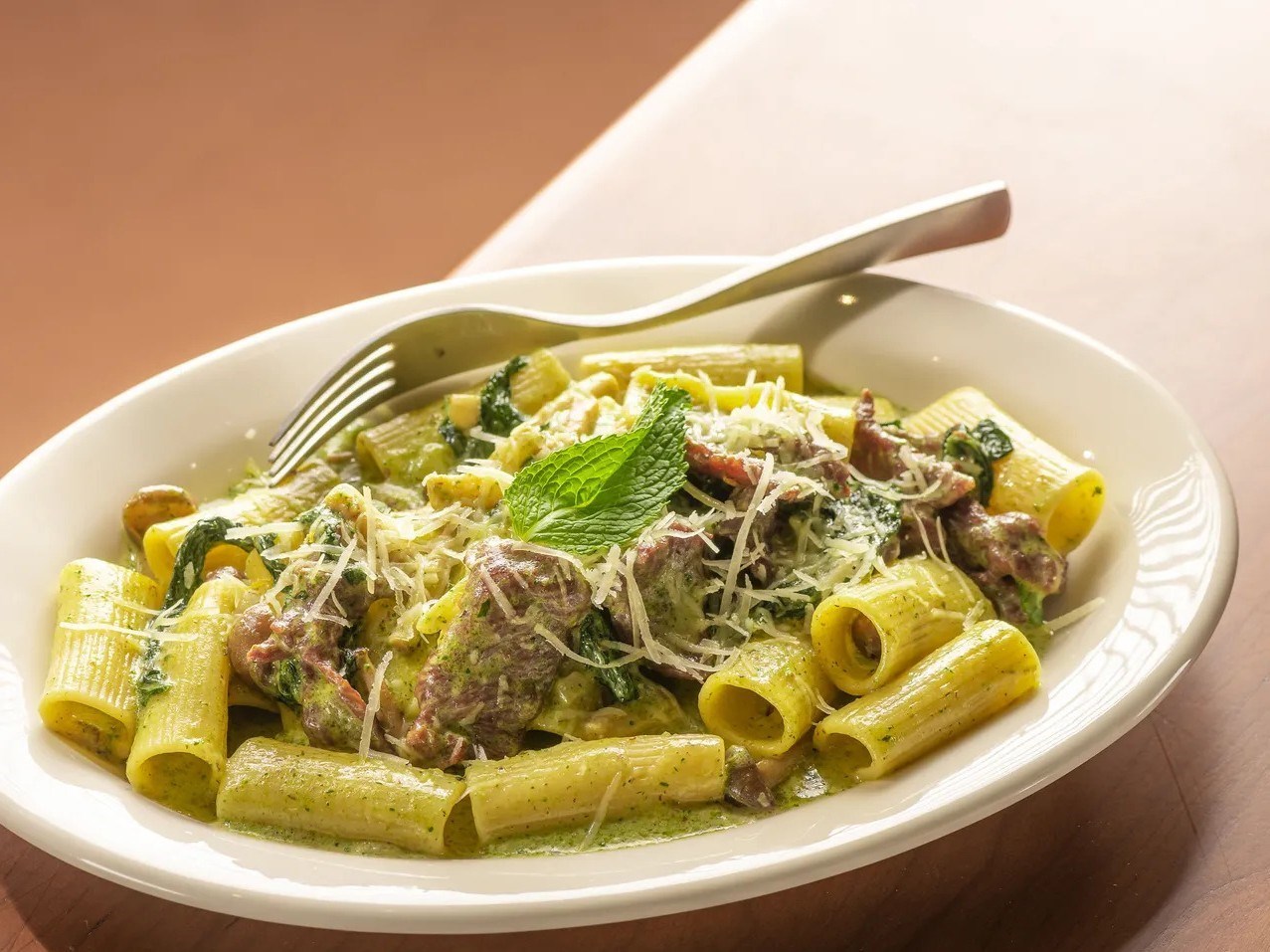 作為清爽口感的代表,這道料理完美解決了青醬類菜品易顯油膩的問題。廚師將新鮮薄荷融入青醬基底,入口即能感受到淡淡的清涼香氣,恰好中和了青醬本身的濃郁感,帶來清爽不膩的體驗。隧道面的管狀紋理具備出色的掛醬能力,每一根麵條都能均勻裹附青醬,搭配嫩而不柴的炒牛肉,肉香與香草香在口中交融,層次分明且回味悠長,即便食用整盤也無負擔感。