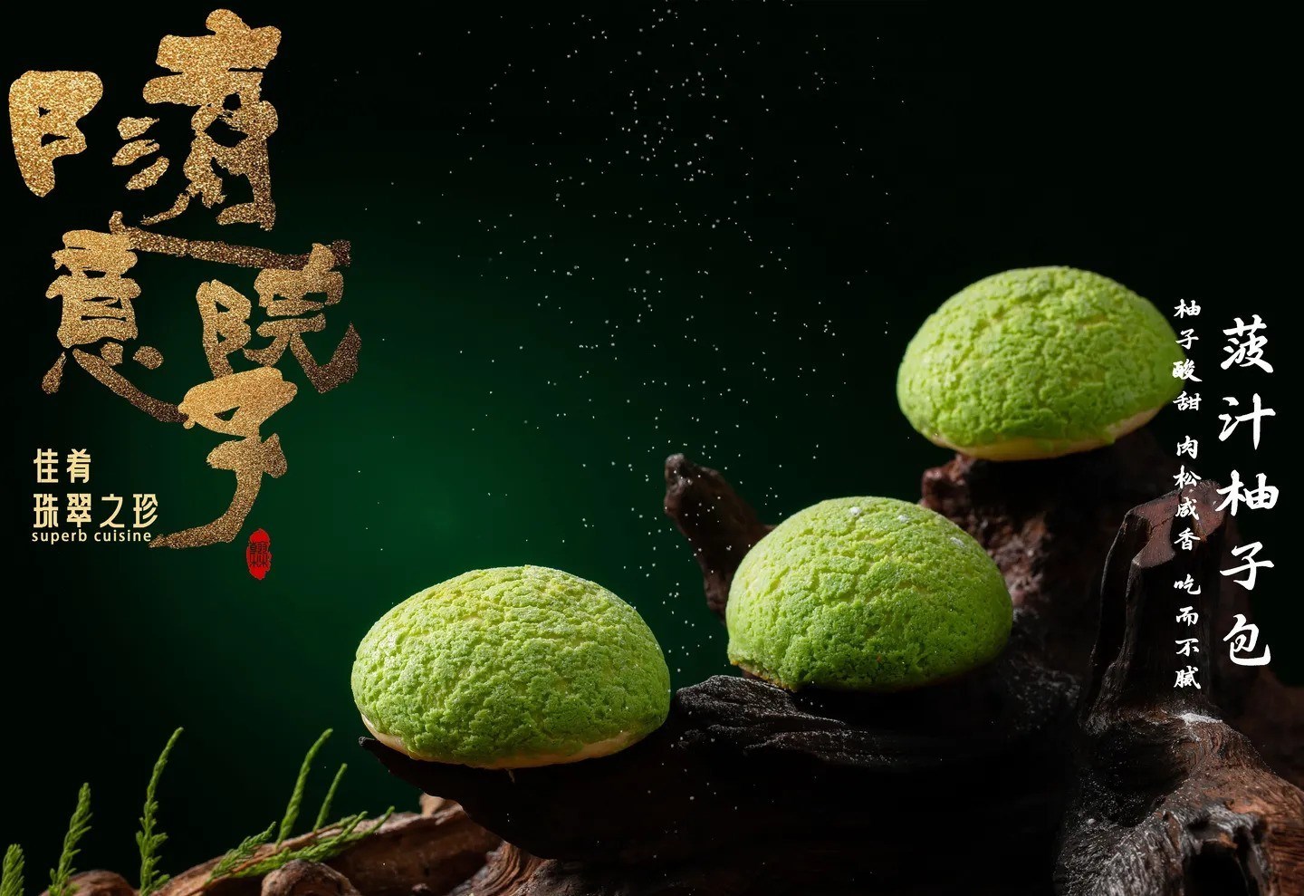 菠汁柚子包用當天現榨菠菜汁揉面,經精準火候蒸制後形成的輕柔紋理,毫無人工色素的生硬感。咬開蓬鬆外皮,內餡的搭配更顯巧思:清甜的蜜柚只留晶瑩果粒,還混合了酥鬆肉松,柚子的鮮酸裹著脆嫩,肉松的咸香中和甜膩。