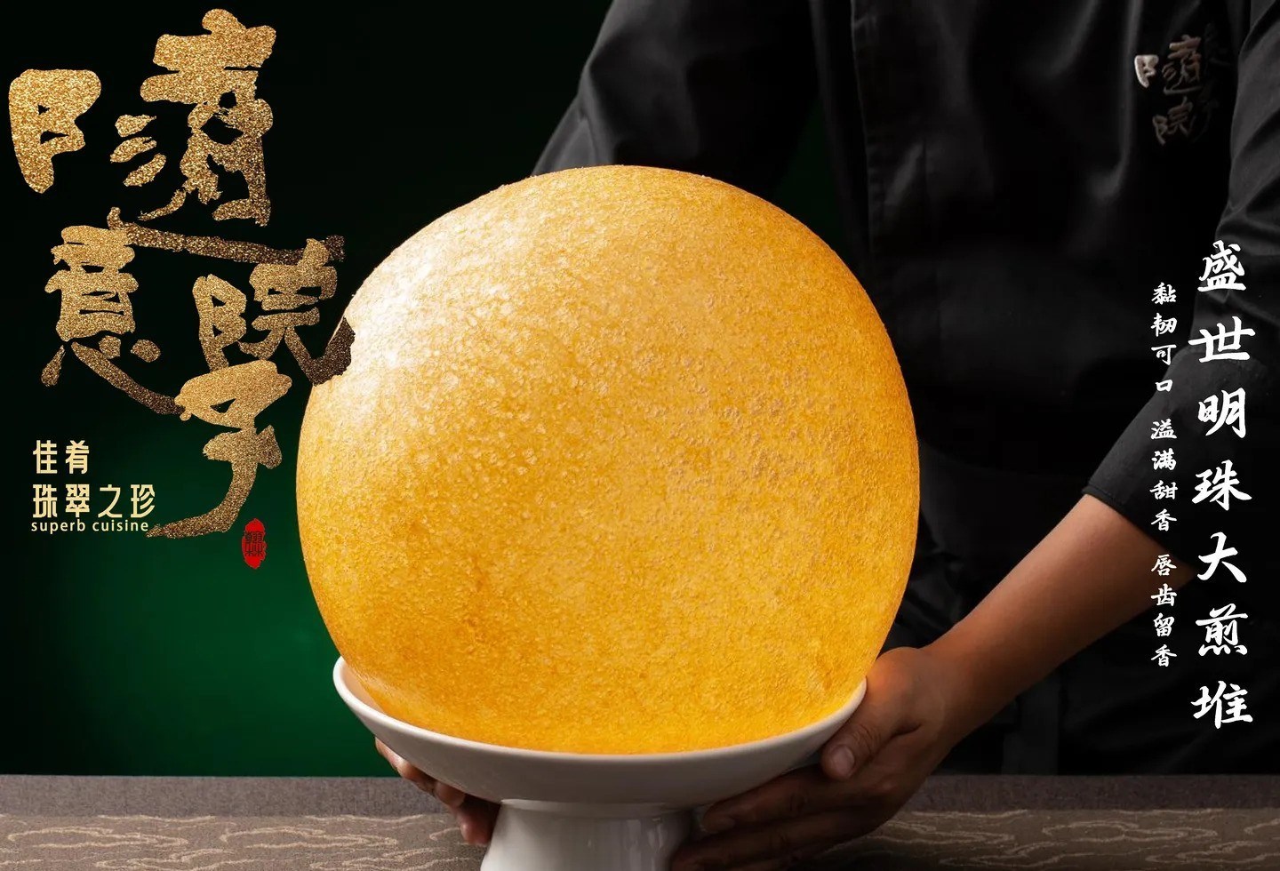 還有被稱作「盛世明珠」的大煎堆,更是上桌即成為視覺焦點。這道嶺南小吃在隨意院子被做成了圓潤飽滿的金黃大球,像一顆透亮的明珠擺在白瓷盤中,表面並無常見的白芝麻,取而代之的是細膩油亮的酥皮,泛著溫潤光澤,恰如「盛世明珠」般貴氣。剛出鍋的煎堆裹著甜香撲鼻,咬下時外皮是輕微酥鬆感,內層卻是黏韌軟糯的質地,不黏牙也不顯油膩,甜香裹著糯米本味在口中彌散。