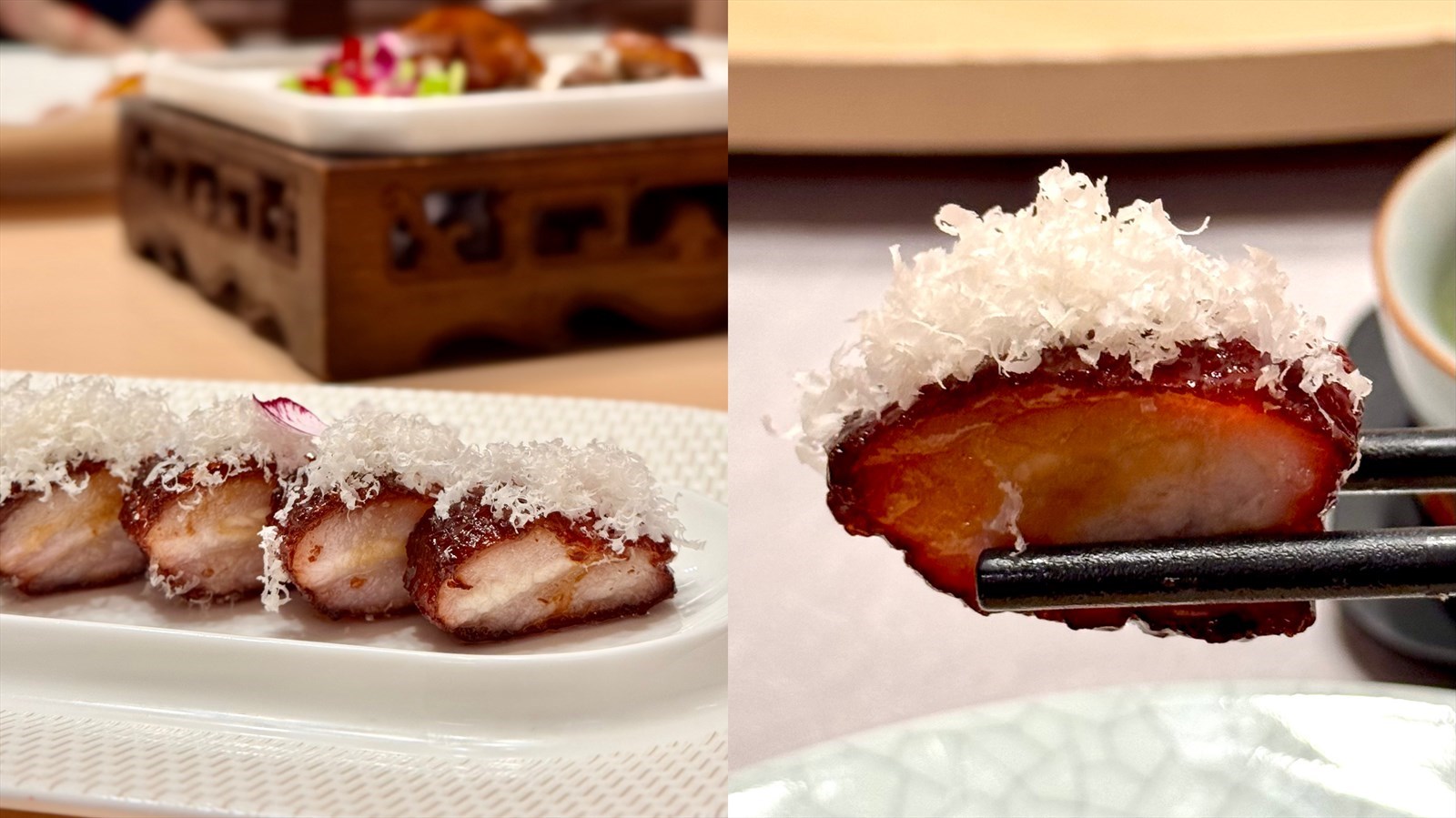 兼具顏值與滋味的創意叉燒,外層裹著一層油亮的黑金脆殼,光看賣相就讓人食指大動,入口外酥裡嫩,豐潤的油脂在齒間慢慢散開,絲毫不顯油膩,簡直是讓開飯仔一吃就認定的「人生叉燒」。