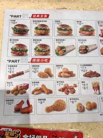 蜜汁手扒鸡 / 香辣鸡翅 / 香辣鸡排堡 / 薯条 / 辣味鸡肉卷 / 黑椒鸡块