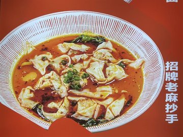 重庆豌豆麻辣小面 / 老成都爆红肥肠面 / 现包骨汤抄手 / 爽口海草 / 川味红烧牛肉面 / 红肠面