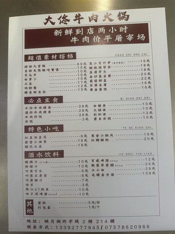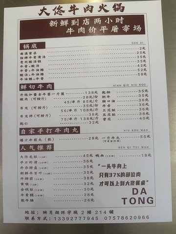大佟牛肉火锅 (映月湖环宇城) (佛山) 网址: https://s.openrice.com/KtLS4m0y2f000 地址: 佛山南海区桂城石龙南路6号映月湖环宇城L2层L214号铺 电话: +86 0757-86209662