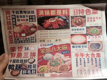 手切黄牛肉 / 卤香大棒骨 / 双椒牛肉丝丝 / 精品肥牛 / 蓝眼泪冰粉 / 大刀白肉