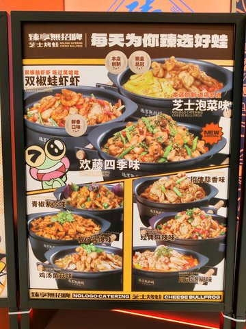 芝士泡菜牛蛙 / 青椒紫苏牛蛙 / 双椒牛蛙虾虾 / 招牌蒜香牛蛙 / 经典麻辣味牛蛙 / 牛油黑椒味牛蛙