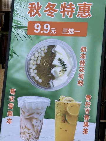 水牛奶冰淇淋 / 香柠百香果茶 / 草莓茉莉绿茶 / 奶冻桂花河粉 / 芒果斑斓河粉 / 巧克力冰淇淋