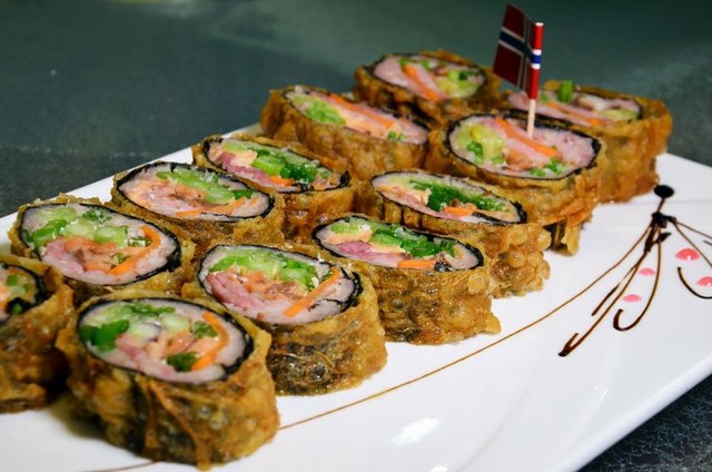 酥炸三文鱼卷:外表经过酥炸,非常金香