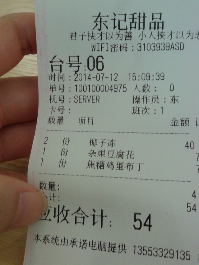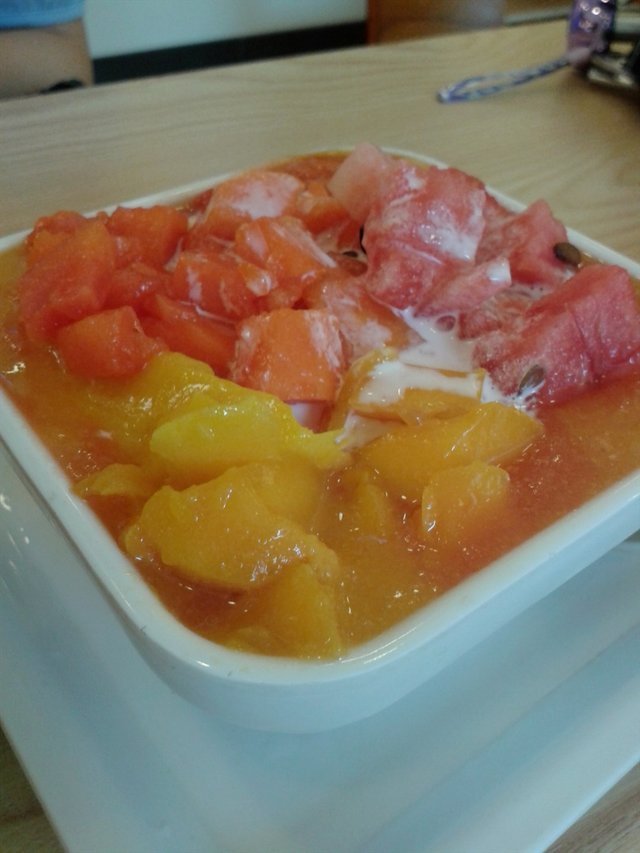 杂果豆腐花:豆腐花是温热的,味道还不错,芒果西瓜木瓜都很新鲜,而且比豆腐花甜,一起吃,口感很奇妙的。不过在这个大热天里吃,冷的水果+热的豆腐花,感觉还是有点怪,我不太喜欢,但是朋友觉得很好吃。