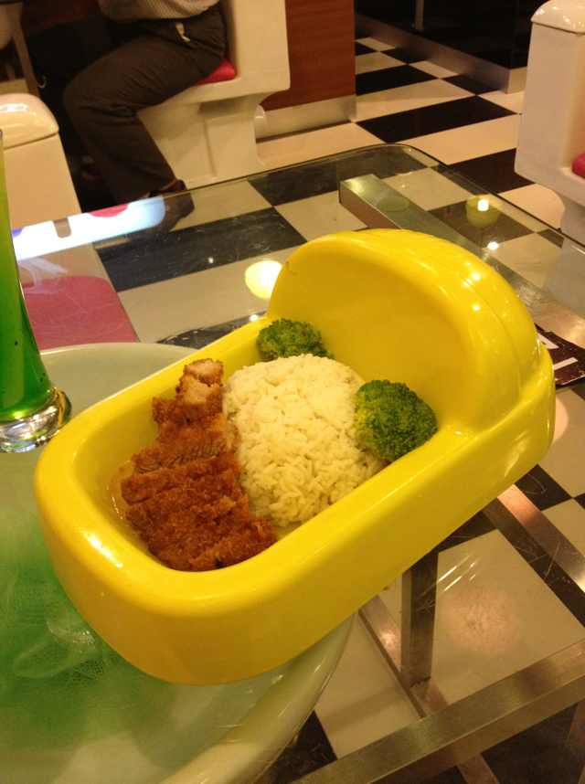这间店位于天河路228号时尚天河商业广场,餐具及座椅均为各类厕所用具形状的,不知为何店里总有股厕所的味道,真的有点倒胃口。外表最为形象的马桶5号味道还不错,是巧克力和香草的雪糕,是马桶系列里最便宜的。咖喱猪排饭也是装在马桶里的,不过卖相并不恶心,味道还OK吧。黄金便便条是从卖相到味道都好恶心,其实就是炸香蕉,真的好难吃。价格不算很贵,人均五十左右,家里的小朋友喜欢,来吃一次尝试一下就可以了。…查看更多