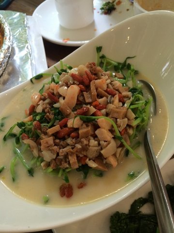 这家食府的环境的确五错,包厢的红木台櫈和摆设都很大气,真有一种高大尚的感觉,出品味道还是不错的,服务就略显逊色,价钱比较贵。卤水老鹅头,这个澄海特有的卤水鹅头竟然是尼到吃到,真是很特别,不过还是比在澄海吃的鹅头要细只D,卤得还算好味,无切开,大大个的,都真是几难入口,个鹅头除了大外,并没有很特别的,上汤豆苗,份量还可以,加了些杞子和香菇碎落去,吃起来口感更加丰富一点,豆苗都几嫩口,个汤底味道很浓郁。