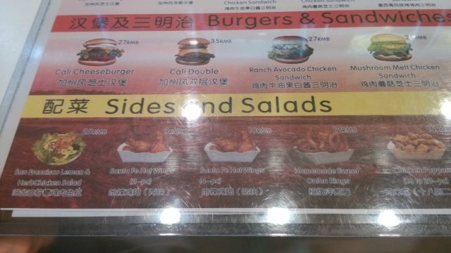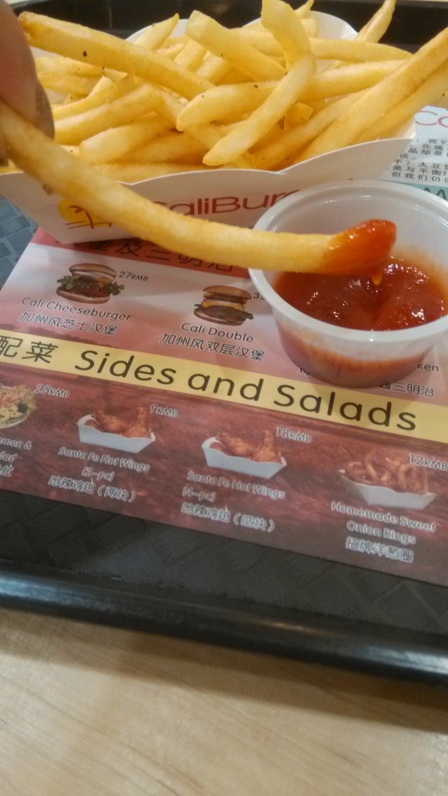 卡利堡,在微博看到他家的宣传,就跑去团购啦。团了两份9.9的套餐,还有几张15元的现金券,只能买小吃。貌似开了一段时间了。做团购也做很久了。我没有及时去,所以感觉质量差了好多。在高德置地广场的中区,位置真心难找。兜兜转转找了好久才找到。店面不算大,位置都比较宽敞。里面干净明亮。但一坐下却觉得其实没那么干净。囧。应该是团购生意多,帮衬的人多。店员都没怎么清洁桌面了。上面有几个大灯泡。哈哈。好可爱。我去的时候人还不算多。去前台验证,MM态度比较一般。去到前台发现上面写着没有鸡米花和洋葱圈!!我团了现金券就是想吃这两个啊。除了这两个,小吃就只剩下什么疯狂薯条,鸡翅还有鸡肉沙拉。。貌似就这三个吧。本来套餐已经有薯条,所以就不想再点薯条了。结果当场团多了一张现金券。最后点了两对鸡翅18块钱,和一份鸡肉沙拉,25块钱。验证完点餐完,店员就给了一个号码牌和两个杯子。饮料是畅饮的,随便喝。哈哈。发现店员人手严重不足。一个下单,一个收拾,一个做餐。所以等得还是有点久的。饮料有可乐,七喜,芬达,还有售罄的零度可乐。居然还有我最爱的柠檬茶!毫不犹豫,倒了一杯柠檬茶。纸杯有点软啊。而且上面居然没有饮店里的logo。呵呵。柠檬茶味道挺不错哇。其实也就是普通柠檬茶,只不过这里没兑水,所以挺好的。等啊等。终于有东西吃啦。汉堡和薯条先上。汉堡有墨西哥鸡肉和蘑菇鸡肉两种选择,我们两个都要了蘑菇鸡肉。鸡肉是现场煎烤的。所以就要稍微等一会才有得吃啦。个头不算特别大啦。里面有新鲜烤制出来的鸡扒,蘑菇,番茄,生菜,洋葱,还有芝士。用料挺丰富。味道挺好的。里面很juicy的感觉。。就是吃一个有点唔够喉啊。哈哈。之前听说这里的薯条很好吃。我感觉也不过如此吧。没什么特别。不过是新鲜炸出来的,还是挺好的。口感我也喜欢,外面脆里面软。不喜欢整条都是硬的。这是一个套餐。9块9一份,还挺划算吧。就是吃完觉得不饱。哈哈。这里的酱料也是自助的。酱料台有番茄酱,黑色的好像是烧汁吧。还有米黄色的沙拉酱,好像有点点芥末味,这个挺好吃。台面感觉比较脏哈,店员没及时清理。其实我觉得每张桌子上都配几瓶酱料会更好吧。好多人在酱料台上面把酱拿回去加,然后加完就不放回原位。囧。还有杯盖,吸管,纸巾。供打包的吧。另一侧还有一个洗手台。还不错,方便洗手。好了。我要来说最坑爹的一道菜了。什么墨西哥烤鸡肉沙律!!看看看看!!就这几小块鸡肉,居然要25块钱!!我真后悔当时没找他们理论。。唉!其实买之前我就看到人家桌子上的这个沙律了。我当时还以为是他们吃剩的。看来这些团购真的是要及早去吃。晚一点的话,质量都会下降。回来后我看人家的照片。鸡肉明明就不会这么迷你。我都不想评价味道了。实在太迷你了。。最后上的是什么辣鸡翅。好吧。一点的不辣。同样也是很迷你。这里有四只,18大洋。味道不过不失吧。皮是挺脆的。但具体吃不出是什么味道,哈哈。吃完了这些。我们都还不饱。。唉唉。还好是团购过来的啊。这餐花了19.8的两个套餐,再加三张现金券是9块钱。总共28.8.。。。好吧。真心不饱!!查看更多