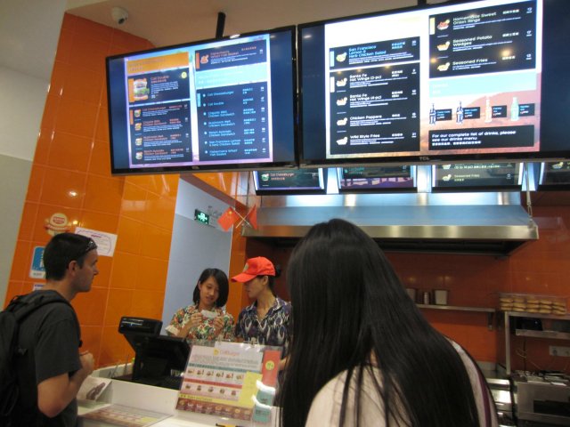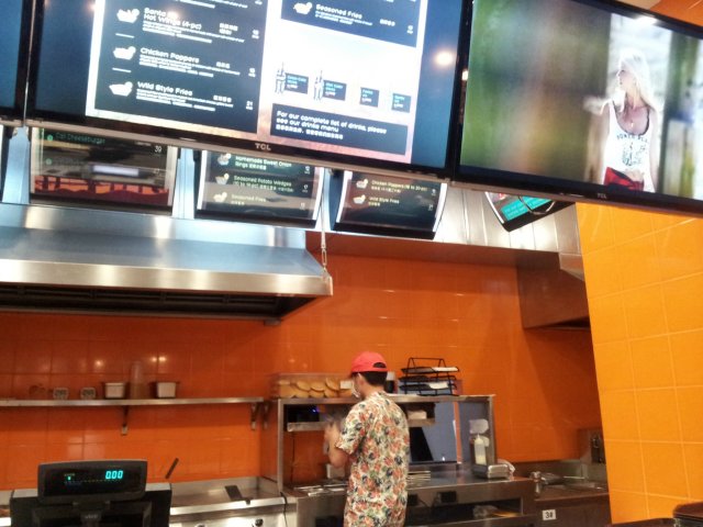花城汇商场很冷清,这家店的人流很很少的。感觉跟麦当劳,肯德基差不多的洋快餐店。优点是饮料可以免费续杯!这里是卖汉堡为主的,下单之后可以看着店员现场制作,对卫生和食材比较放心!然后酱汁是自己在自助区加的,有芥末酱,番茄酱,辣酱,沙拉酱等,汉堡很巨大一个,中间的牛肉很厚,然后再一层芝士,一层生菜,一层番茄,一层青瓜,用料非常足!在口味上感觉跟麦当劳的汉堡味道差不多,就是足料很多!而且价格也可爱很多。总的来说性价比还是比较高的!查看更多