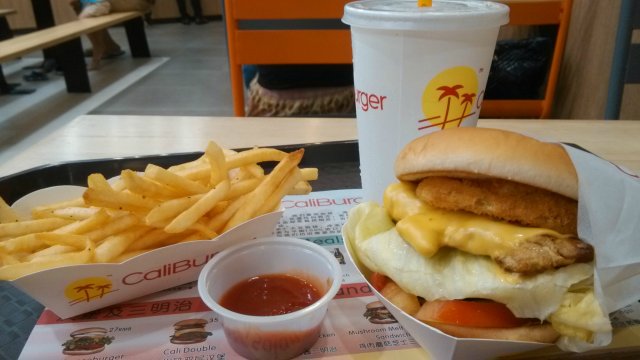 这家位于花城汇的卡利堡餐厅,主打美式汉堡,号称是正宗美国加州风味,这在广州的西式快餐店里面也算是比较少见的。餐厅的店面比较宽敞,座位也算是比较舒适。餐桌上有菜单可以看,种类不算多,而且价格比较贵。点餐之后,店员便会在柜台后面的制作台那里现场制作,过程一目了然,看得到所用的材料也让人比较放心。这家的特色之一就是酱汁是在自助区自取的,可以依照个人喜好去挑选。酱汁的种类有四五种之多,我比较中意芥末蛋黄酱,觉得这款用来配薯条非常不错。尝试了三款不同口味的汉堡,单点汉堡的话可以免费升级成套餐,加多薯条和饮料。三款汉堡的芝士都加得非常足,还搭配了厚厚一层的蔬菜,使整个汉堡看起来个头很大,很有巨无霸式汉堡的风范。牛肉汉堡用的是十分厚身的牛汉堡肉,和芝士的味道是最搭的。鸡肉牛油果白酱汉堡所用的白汁酱的味道很独特,跟鸡肉的风味也是挺般配的。可惜用的是鸡胸扒,口感上稍微有点逊色。相较之下主料相同的墨西哥烤鸡肉汉堡就略逊一筹了,不甚突出的调味使得鸡胸扒肉质上过韧的口感太过明显。这家的汉堡最主要的问题是所用的面包片比较一般,以至于汉堡稍微放久一点的话面包片就会因为吸了过多酱汁和蔬菜的水分而变得软塌塌的,如果面包片事先经过烤制的话可能就不会出现这个问题了。薯条炸得不错,不会很油,挺香脆的。堂食的话套餐的饮料是可以免费续杯的,只要把空纸杯拿过去柜台给店员就可以。不过可选的只有碳酸饮料,并且不可以走冰的。环境和服务态度总体来说算是不错的,不过口味上没有感觉出“加州风味”的美式汉堡与一般的汉堡有什么大的区别。原价相对来说性价比不算很高,有团购之类的优惠活动的话相信会更合适一些。查看更多