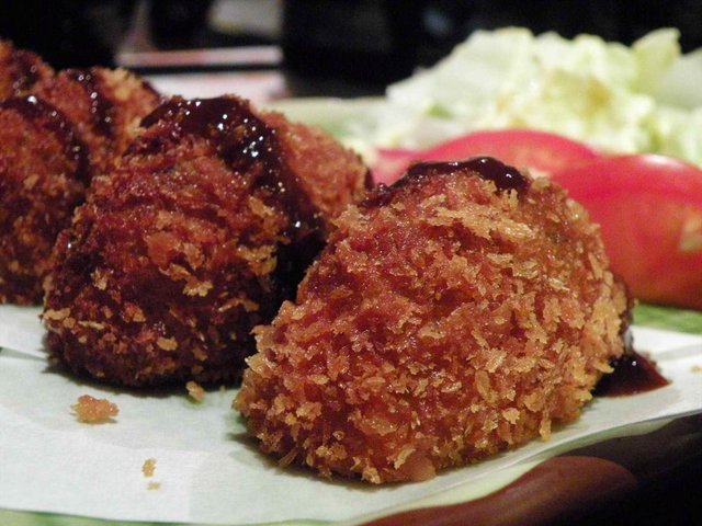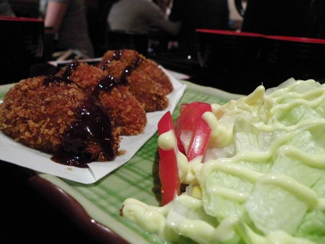 新年伊始,是日中午和部门同事一起去公司附近的餐厅吃午餐,同事提议和风中华居酒屋。蚊滋还没去过居酒屋,所以就一起去试试看啦。这家居酒屋地址比较隐秘,在一座天桥底下,平时比较少经过这边呢。里面环境比较昏黑,看到门口处有榻榻米吖,好有日本的感觉的说。同事推荐一定要试大阪海鲜饼(27元),一个吉列猪扒定食(15元),一个烧肉饭和一份寿司。寿司有两件腐皮寿司和三文鱼酱寿司,味道不错。吉列猪扒定食,有猪扒、两件寿司、沙拉和米饭,分量十足,猪扒新鲜炸起,不过酱汁不多,吃起来有点干巴巴。同事的烧肉饭超好吃的,虽然不是定食,但是饭里的烧肉分量十足,而且酱汁多而美味。最后的海鲜饼也是一大惊喜,上面铺满沙律酱和木鱼片,闻起来就香气扑鼻了,里面还有许多新鲜的鱿鱼粒,味道有点像是pizza状的小丸子,十分好吃。这里还可以用网上的会员卡打折,十分优惠,性价比十足哦。查看更多