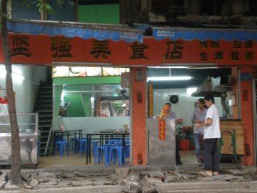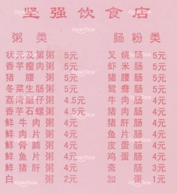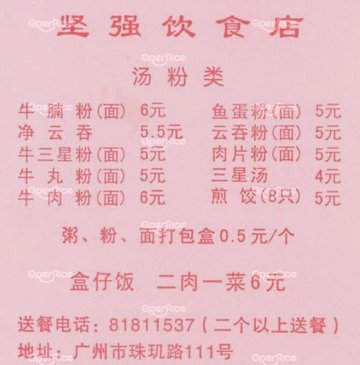 这家坚强饮食店应该也算是老字号了,开了很长时间。他家是典型的粥粉面店,虽然店门不算小,当时很简陋,环境较差。供应的无非是粥粉面拉肠之类的,还有三星汤、煎饺等。肠粉和粥价格在5-7元之间,比附近同类的小食店稍微贵一些,味道也差不多,分量大一些。中午,他家有供应快餐盒饭。