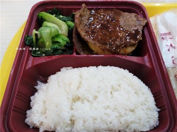 下班到家还买了菜,但突然发现肉忘了提早解冻了,懒惰发作,不如又吃大西豪啦。散个小步走去大西豪,门庭冷落的晚饭时段,自从vip才能买优惠餐之后,明显少了很多食客,随便坐,不用客气。原来今天是孜然排骨饭特价,特价甜品是个很古怪的红豆拌芒果布丁,早知道就不来了,吃别的多好啊,不过既然来了,还是孜然排骨饭。孜然排骨饭的排骨不怎么靠谱,配菜倒是不少,排骨肉很少,骨头多,而且有很多碎骨,不好吃。