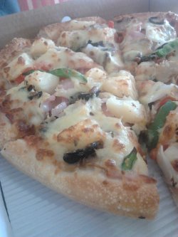 比萨连锁店,系香港名下的,分店非常多,不过都系比较偏的位置,有时唔系咁容易稳到,外送系最方便,都真系加收3元。鸡翅,其实就系全翅分开两份啦,就系双人套餐里面的,我都系觉得中翅的口感会滑D,肉嫩嫩的,好入味,唔系新奥尔良的香味,系比较简单的烤,味其实都唔错,里面的肉非常入味。海鲜比萨,分量足,不过我觉得海鲜的鲜味一般,可能系冰鲜的海鲜,所以就唔系太鲜味,饼底做得好吃,软软的。…查看更多