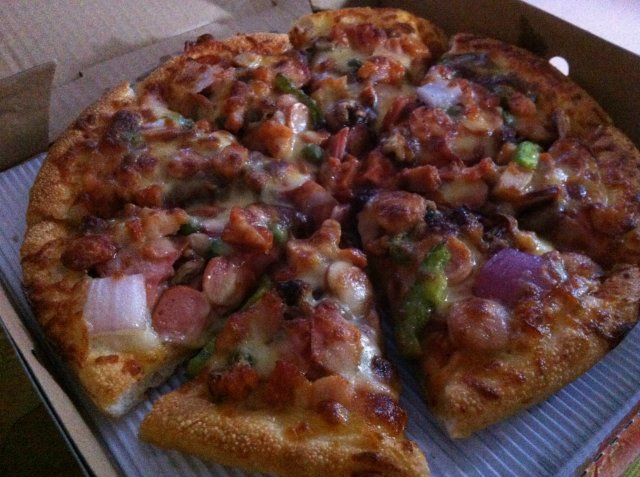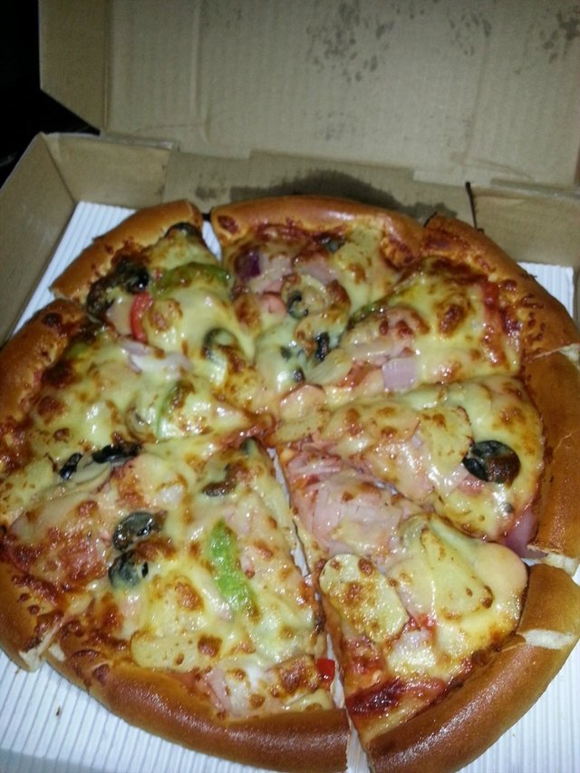有段时间没有来吃尊宝披萨。今天下着雨忽然很想吃披萨。看到有团购便宜一点就决定来吃。现在也已经升价了。记得上次团购才是49块钱。现在团购的价格已经到了63块钱。看来价格都是越升越高。下班就赶过来。不到六点就到了店里。已经没有位置坐了。尊宝的店铺都是蛮小。大概就能是容纳二十多三十人。服务员很忙。解决店里的点餐。还不断地接外卖的电话。两个人的套餐也蛮丰富。有个披萨。四串骨肉相连。一对鸡翅。等了30分钟我们的披萨才上桌。之前的时间里。看着别人吃也真真是够了。选了超豪华披萨。类似一个杂烩。热腾腾的披萨很吸引人。尊宝的披萨味道是不错。我倒是觉得比必胜客的好吃。价格也更实惠。今天的超豪华披萨也是蛮好吃。但芝士味没怎么吃到。我吃披萨用喜欢浓郁的芝士。会更有香气也让披萨的口感更丰富。也有我个人比较喜欢吃的菠萝。微酸微甜的味道带走一点清新的口感。蔬菜和火腿肉等一些的搭配我不错。但没有多一些肉感觉吃得不过瘾。两个女生一个披萨吃不完。骨肉相连和鸡翅的包装盒和不错。但这两样食物油份比较多。骨肉相连的那个酱料味道很浓郁。但酱料的味道没有渗透到肉里面。鸡翅挺好吃。奥尔良烤翅的味道。肉很嫩。…查看更多