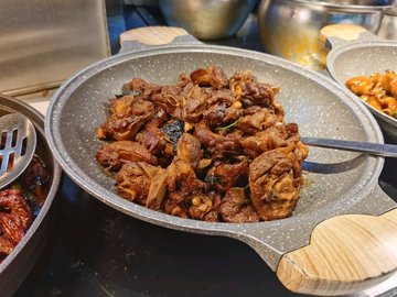 红烧土豆片 / 超多蛋的番茄炒蛋 / 沙姜白切鸡 / 虫草花乌鸡 / 红烧茄子 / 韭菜猪红