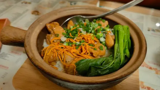 甘香腊味煲仔饭 / 茅根竹蔗水 / 陈皮姜丝牛脊肉煲仔饭 / 精选石斑鱼粥 / 鲜虾云吞面 / 至尊黑棕鹅