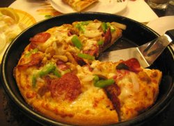 到通州时经常去的一家必胜客。在通州主要干道新华大街上,位置很好找,就在西门,马路南侧。门脸挺大,由于是平时中午去的,所以不需要等位。点的经典的超级至尊披萨,还有那个香肠披萨、洋葱圈、鸡翅、金枪鱼沙拉、奶油蘑菇汤和可乐。 虽然人不多,但是披萨还是等了一会才上。感觉饼做的有点干,但整体味道还好,芝士很浓郁,馅料很挺多的,肉粒清晰可见。洋葱圈和鸡翅挺油的,比之前做的差。金枪鱼沙拉金枪鱼给的相当少,这个较比失望。不过我最喜欢的奶油蘑菇汤很好喝。查看更多