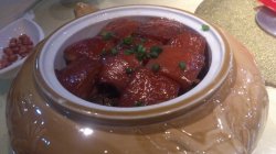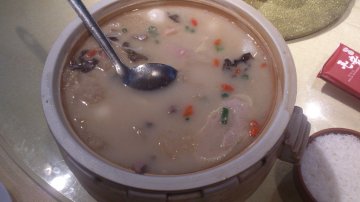 公司到这边聚餐,吃了不少特色的毛家菜色。印象最深的是这2个,东坡肉和猪杂汤。东坡肉看上去很肥很腻,但是吃下去的时候一点都不腻,很甘香。五花腩肉分层,一层肥肉一层瘦肉。下面还有些酸豆角,配着吃没那么腻。猪杂汤。新鲜的猪杂和白胡椒一起煮,非常的鲜甜,而且不会有怪味。冬天吃,喝下去,好暖和呀。