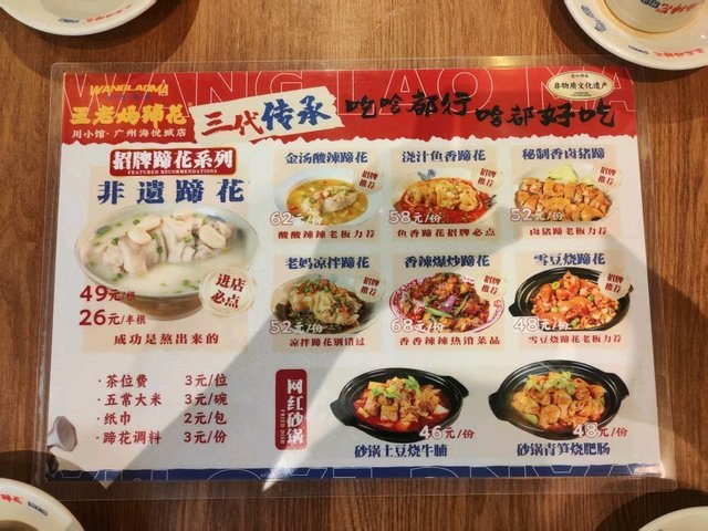 王老妈蹄花·川小馆 (海悦城) (广州) 网址: https://s.openrice.com/KtLS0m03BEJ00 地址: 广州天河区龙洞迎龙路3号海悦城B区2F层 电话: +86 19076004836